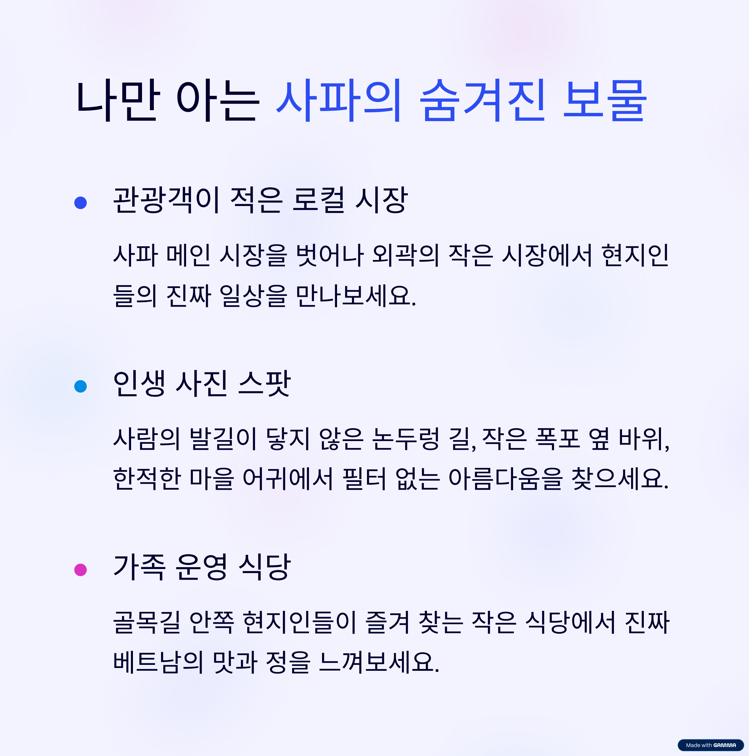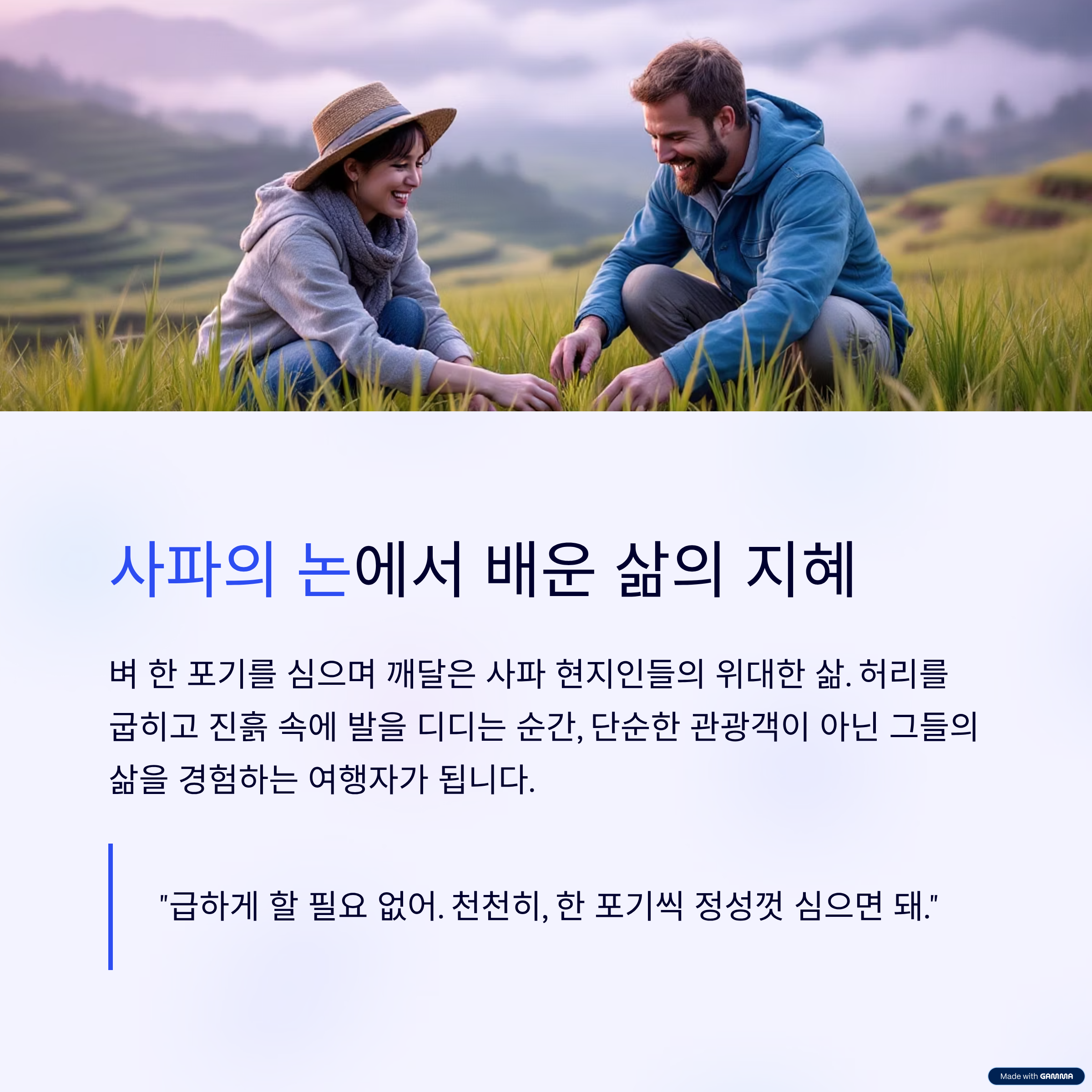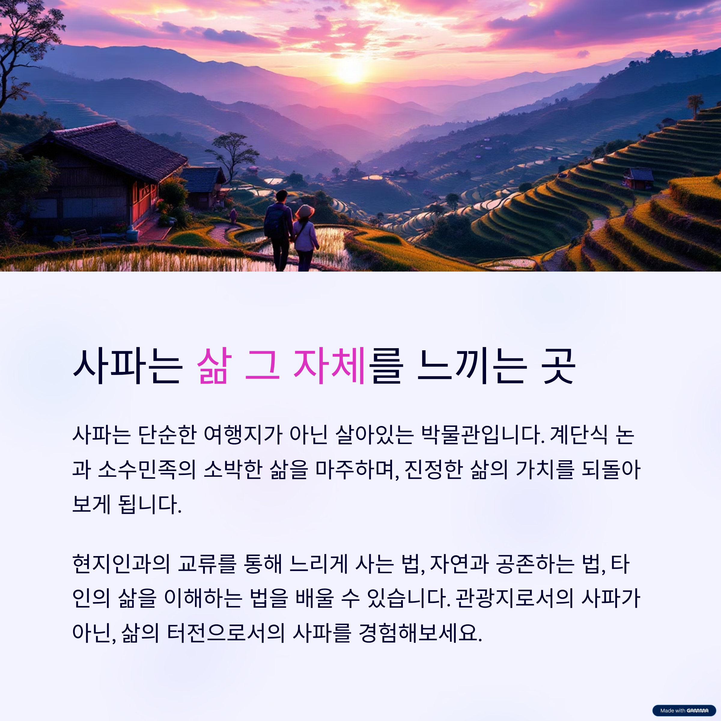 여행지에서 잊지 못할 추억을 넘어, 삶의 진정한 의미를 찾아가는 여정. 저와 함께 '진짜 사파'를 만나러 떠나볼까요?