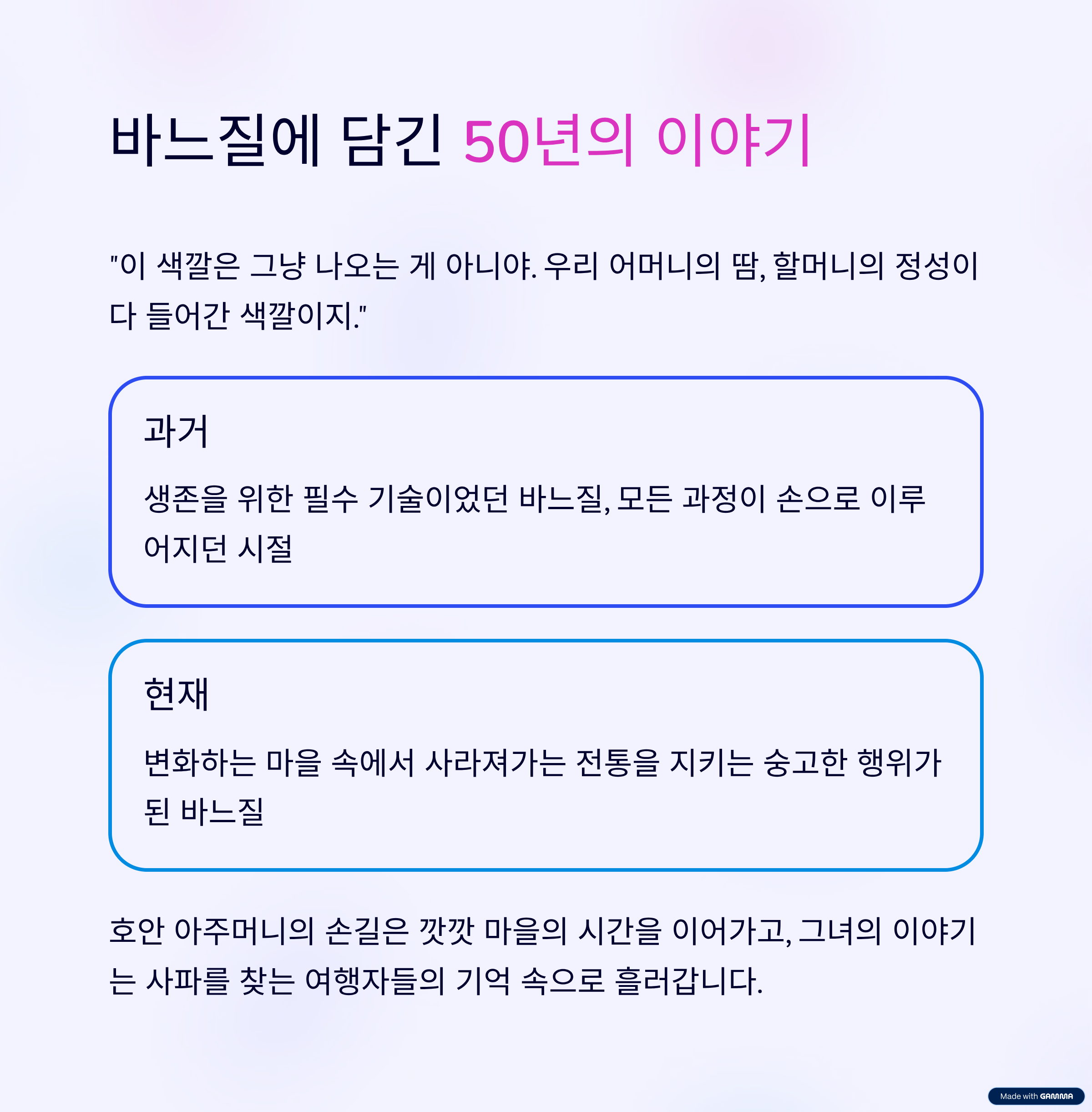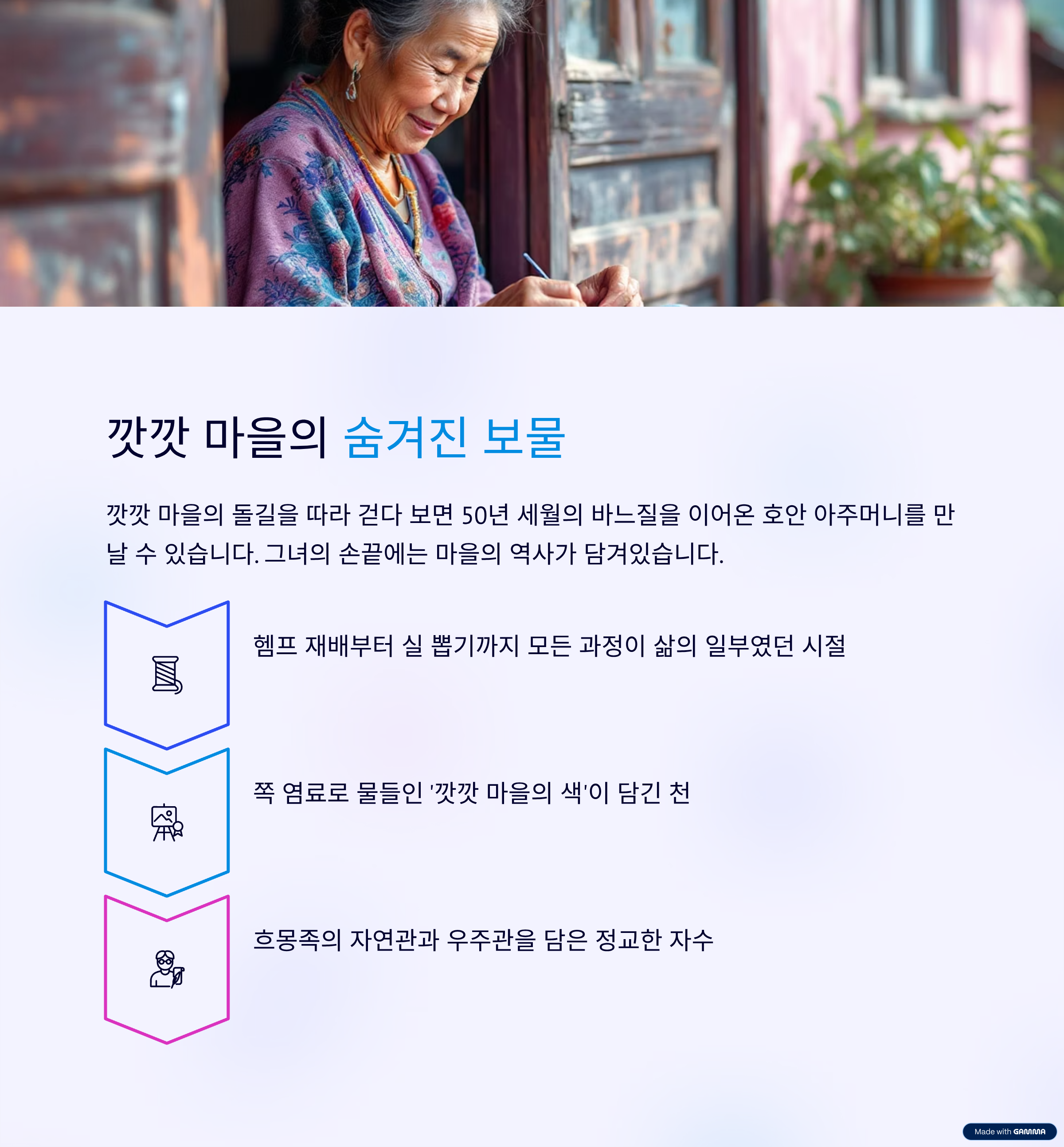 아주머니가 바늘로 한 땀 한 땀 놓는 실에는 헴프 줄기를 다듬던 어린 시절의 기억, 쪽 염료에 손을 물들이던 청년 시절의 추억, 그리고 바느질을 하며 키워낸 자식들의 웃음이 담겨 있습니다.
