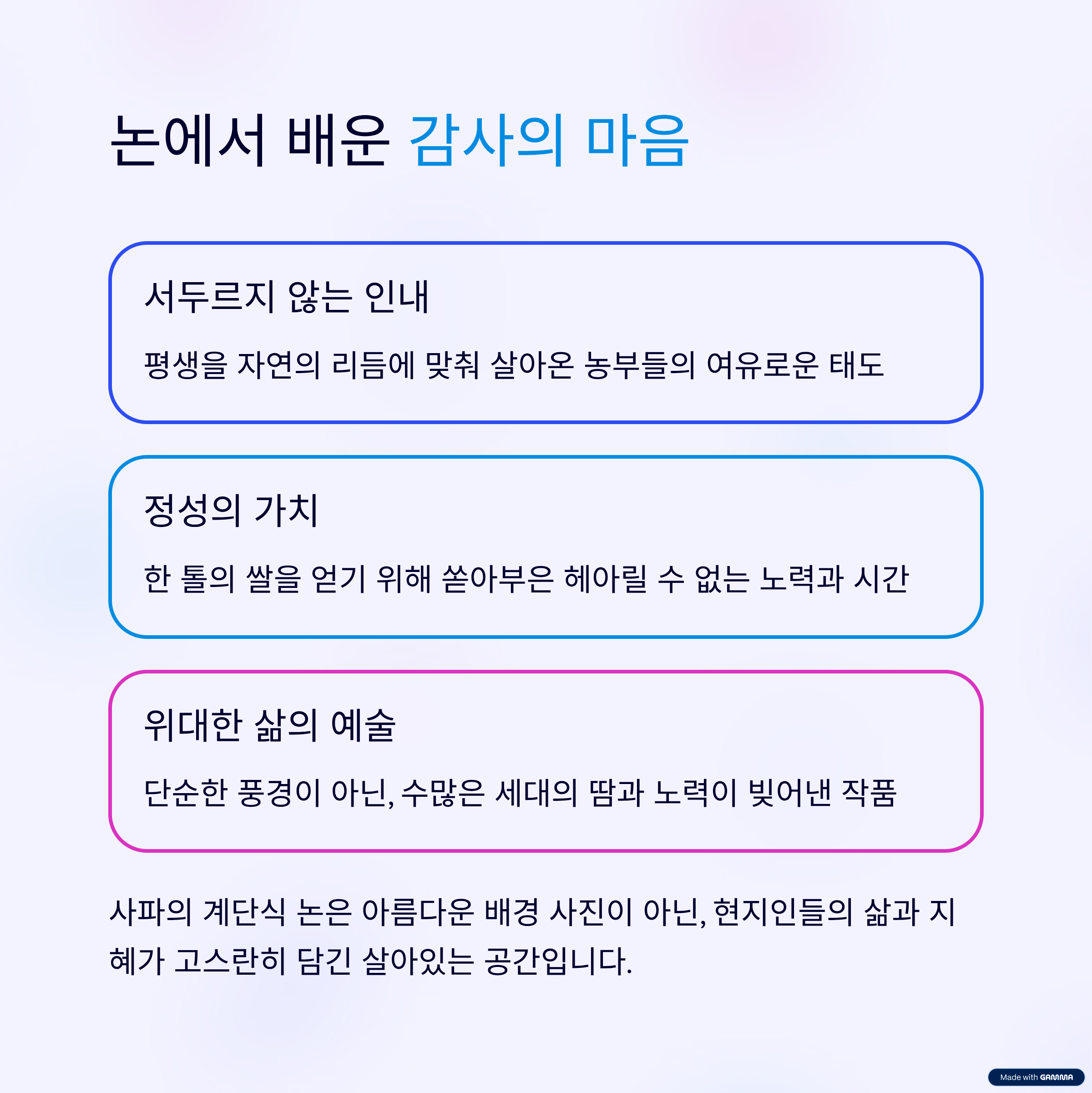 험난한 지형에 계단식으로 논을 만들고, 물을 끌어와 벼를 키우는 이 모든 과정이 얼마나 고되고 위대한 일인지 비로소