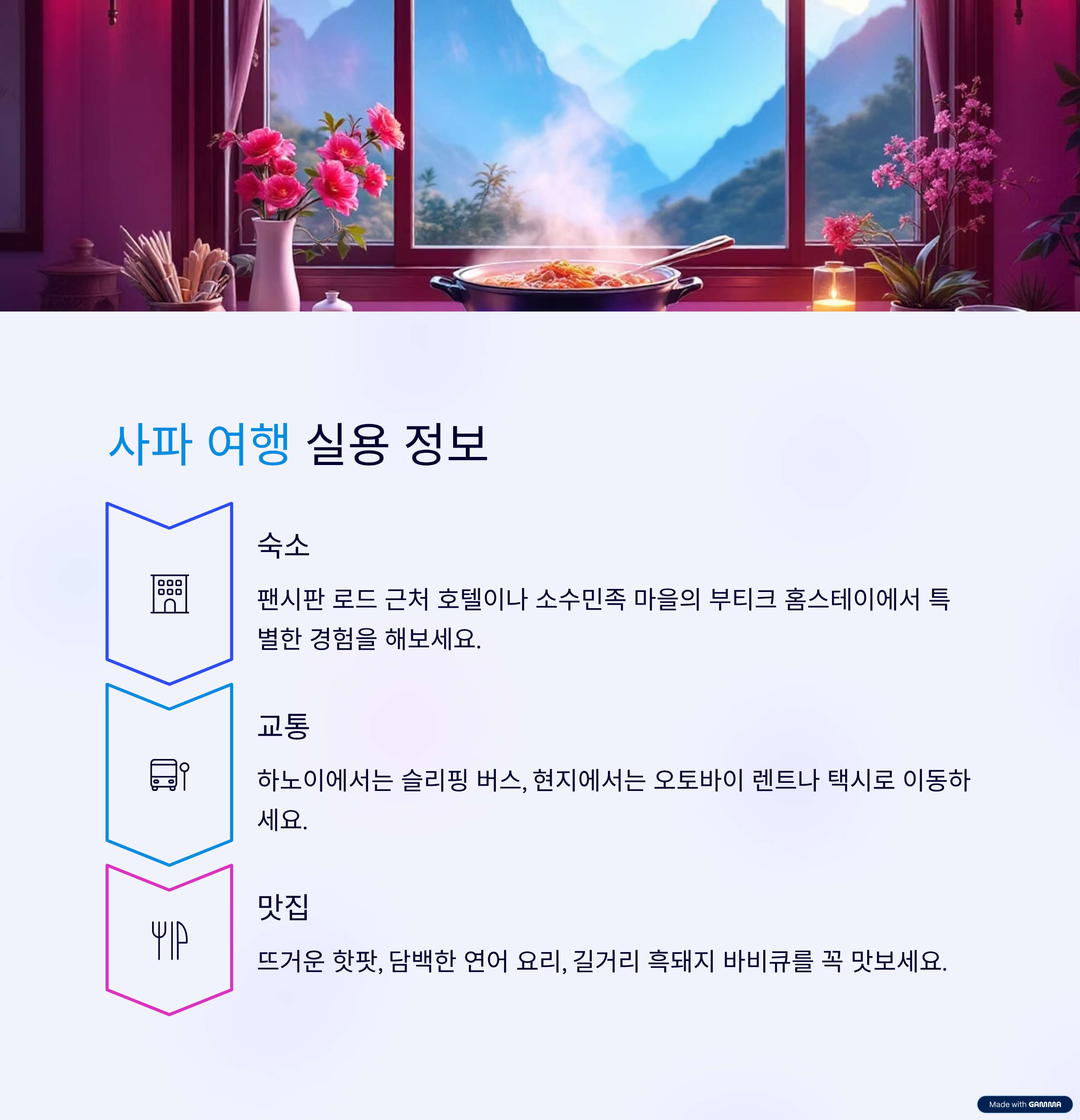 사파 여행을 준비하며 '사파'를 검색했을 때, 수많은 블로그 글을 보셨을 거예요. 아름다운 계단식 논 사진, 현지 음식 후기, 트레킹 코스 정보까지. 하지만 혹시 이런 고민을 해보진 않으셨나요? "사진은 다 비슷한데, 이 마을에 사는 사람들의 진짜 이야기는 어디서 찾지?", "모두가 아는 정보 말고, 나만의 특별한 경험을 남기고 싶은데…."