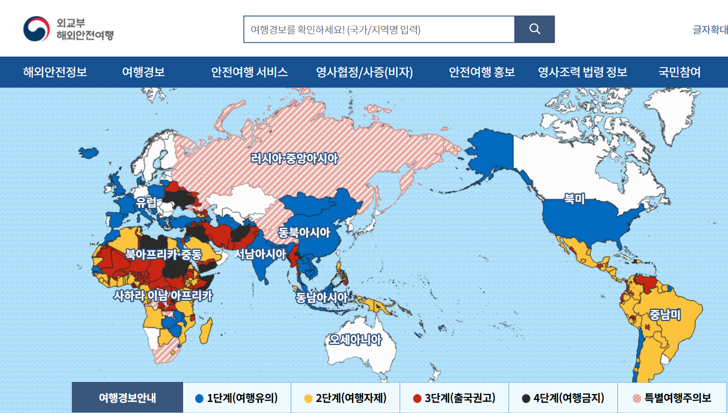 가장 먼저 확인해야 할 것은 바로 '여행경보'입니다. TV 뉴스에서 가끔 '어느 나라에 여행경보가 발령되었습니다' 하는 이야기 들어보셨죠? 그 내용이 바로 이 사이트에 자세히 나와 있어요.